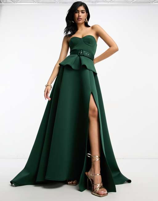 ASOS DESIGN - Vestito lungo a fascia verde scuro premium con fondo peplo, cintura e spacco sulla coscia