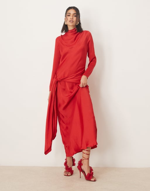 ASOS DESIGN - Vestito lungo a maniche lunghe allacciato sul davanti in raso rosso