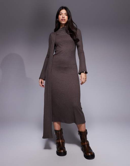 ASOS DESIGN - Vestito lungo a maniche lunghe color cioccolato con foulard