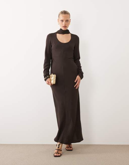 ASOS DESIGN - Vestito lungo a maniche lunghe marrone cioccolato con scollo rotondo e sciarpa