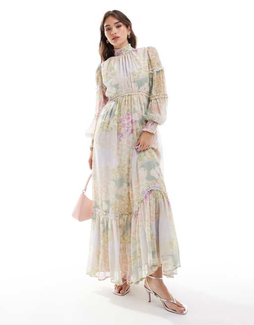 ASOS DESIGN - Vestito lungo accollato e arricciato con stampa a fiori misti e volant sui bordi