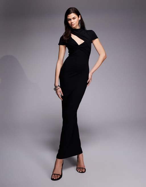 ASOS DESIGN - Vestito lungo accollato nero con maniche ad aletta e nodo asimmetrico sul busto