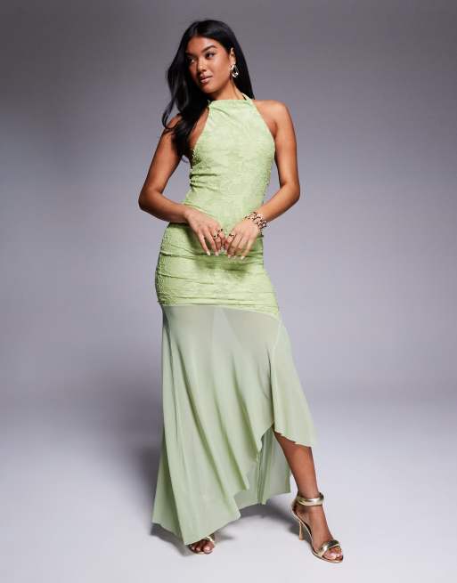 ASOS DESIGN - Vestito lungo accollato verde con gonna trasparente