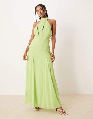 ASOS DESIGN - Vestito lungo allacciato al collo con vita scesa in chiffon verde acceso