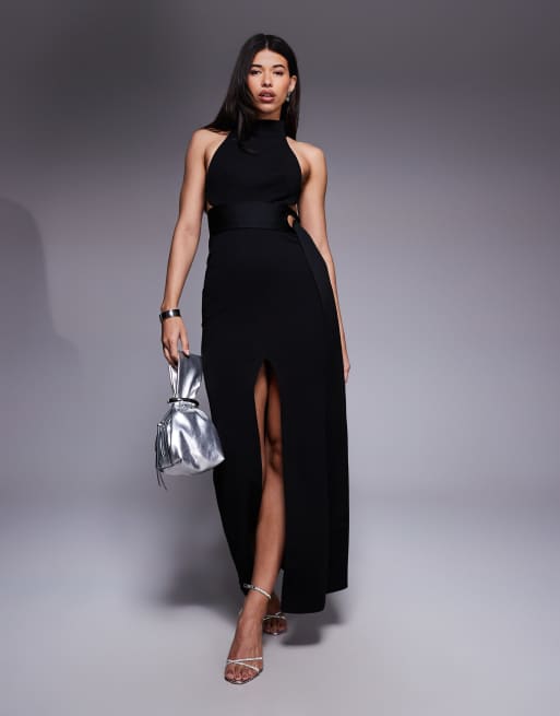 ASOS DESIGN - Vestito lungo allacciato al collo nero con spacco e cintura annodata