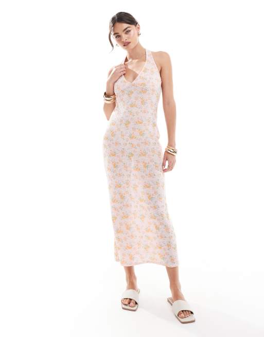 ASOS DESIGN - Vestito lungo all'uncinetto allacciato al collo con stampa a fiori allacciato sul retro