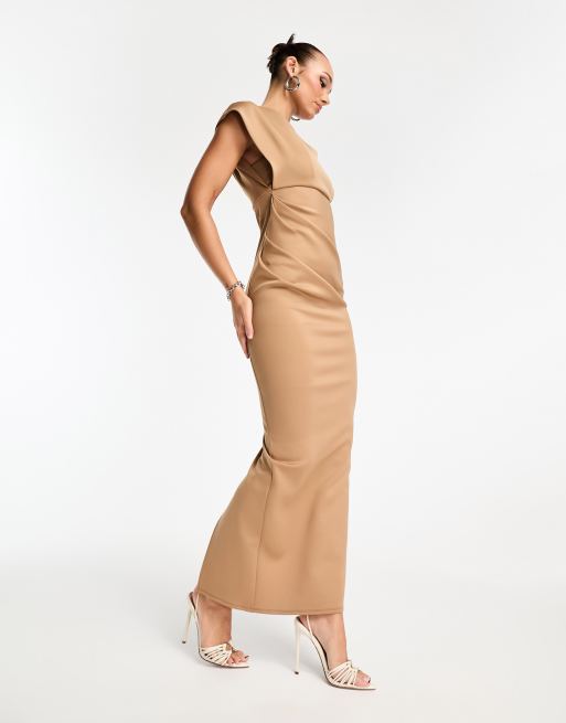 ASOS DESIGN - Vestito lungo asimmetrico accollato stile minimal color cammello