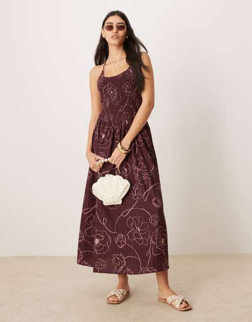 ASOS DESIGN - Vestito lungo bordeaux a fiori stropicciato con incrocio sul retro e scollo rotondo