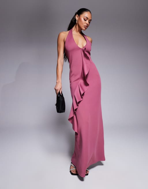 ASOS DESIGN - Vestito lungo color gelso in tessuto effetto scuba con scollo profondo e volant sul davanti
