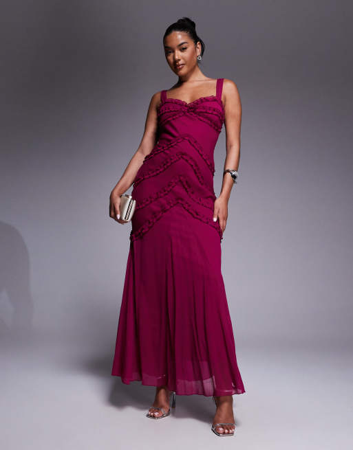 ASOS DESIGN - Vestito lungo color lampone con spalline sottili e volant
