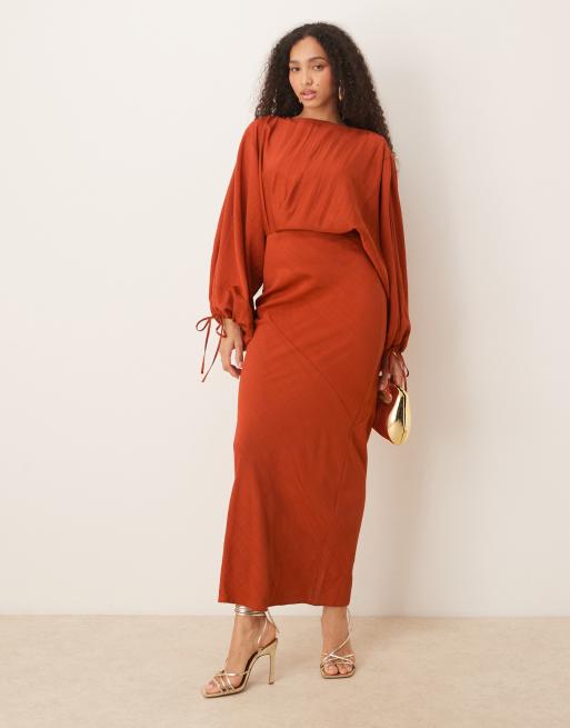 ASOS DESIGN - Vestito lungo con manica a campana, plissettatura e laccetti color ruggine