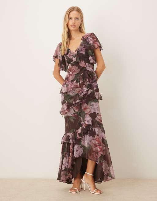 ASOS DESIGN - Vestito lungo con stampa a fiori su base scura, volant asimmetrici, bordi grezzi e fondo asimmetrico