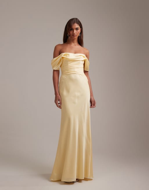 ASOS DESIGN - Vestito lungo da cerimonia in raso color limone con scollo alla Bardot