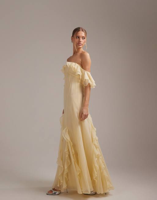 ASOS DESIGN - Vestito lungo da damigella in chiffon giallo con scollo alla Bardot e volant