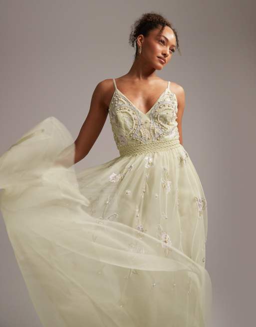 ASOS DESIGN - Vestito lungo da damigella verde salvia con spalline sottili decorato con perle e ricami floreali