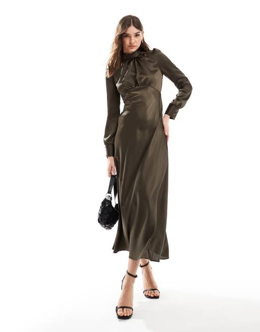 ASOS DESIGN - Vestito lungo da giorno accollato in raso kaki