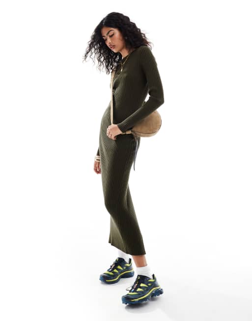 ASOS DESIGN - Vestito lungo girocollo in maglia a coste kaki