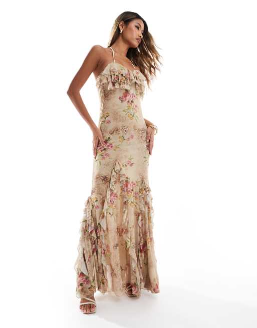 ASOS DESIGN - Vestito lungo godet animalier in tessuto a rete con coppe e volant