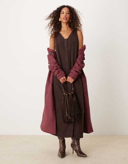 ASOS DESIGN - Vestito lungo in denim marrone con bottoni