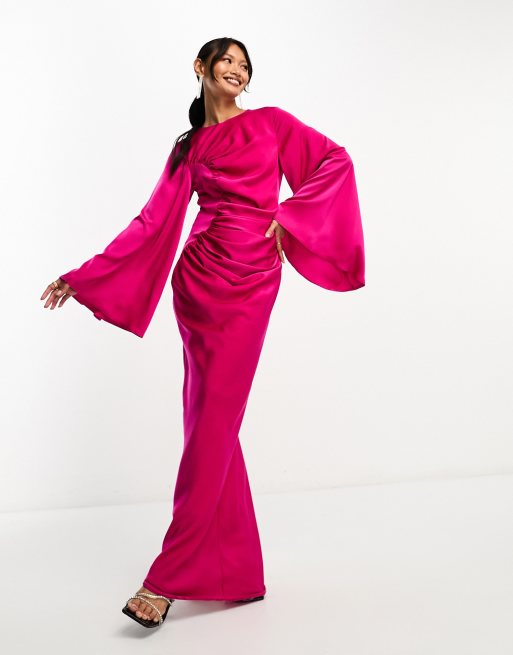 ASOS DESIGN - Vestito lungo in raso arricciato rosa acceso con maniche lunghe