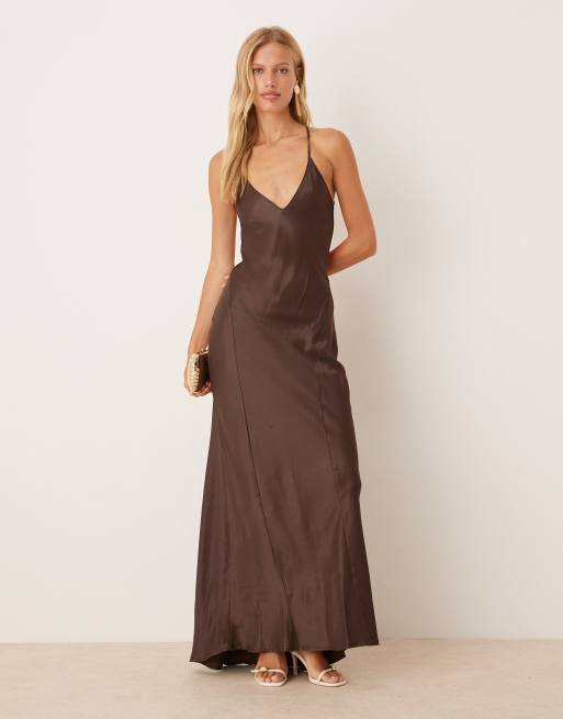 ASOS DESIGN - Vestito lungo in raso color cioccolato con cuciture
