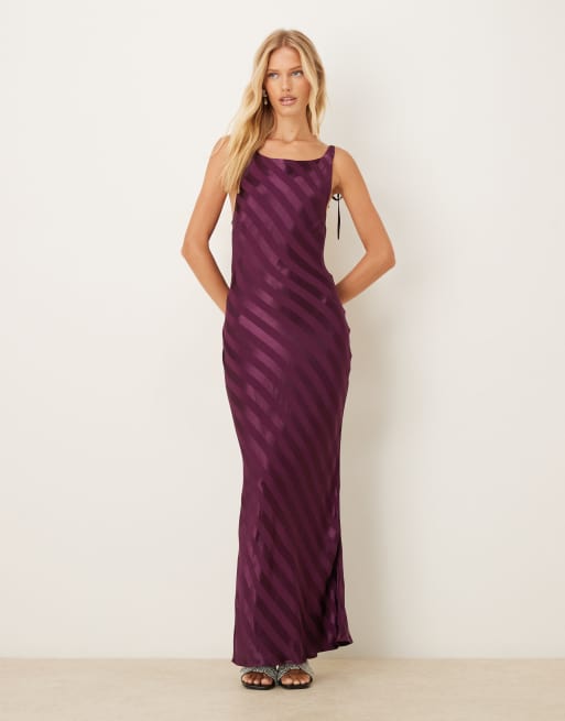 ASOS DESIGN - Vestito lungo in raso con scollo ad anello sul retro color prugna a righe