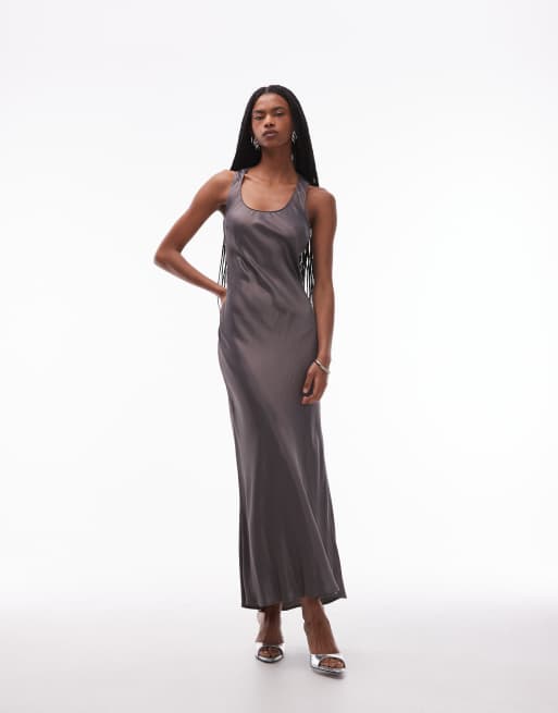 ASOS DESIGN - Vestito lungo in raso grigio antracite con scollo rotondo