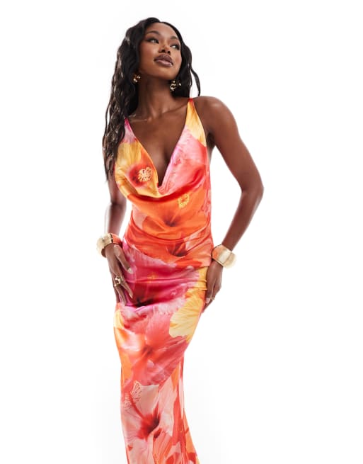 ASOS DESIGN - Vestito lungo in raso stretch con scollo ad anello rosa con stampa di fiori di loto