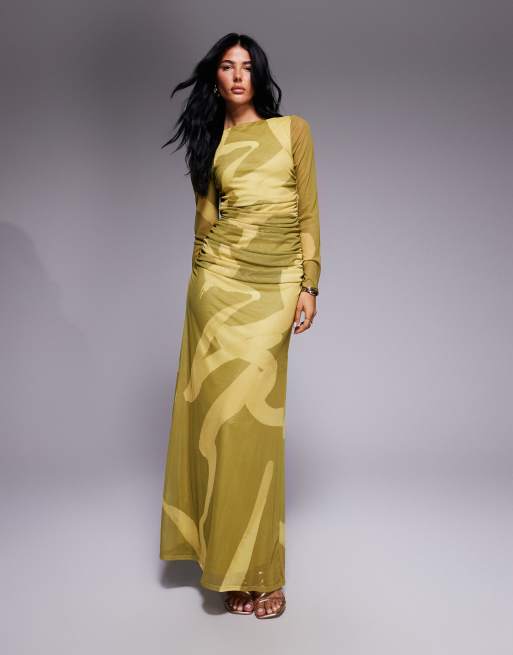 ASOS DESIGN - Vestito lungo in rete a maniche lunghe arricciato in stampa astratta