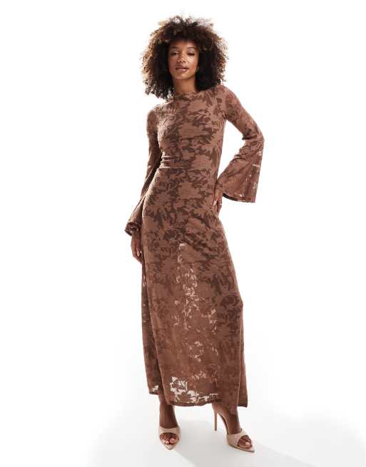 ASOS DESIGN - Vestito lungo marrone dévoré con gonna a ruota e maniche svasate