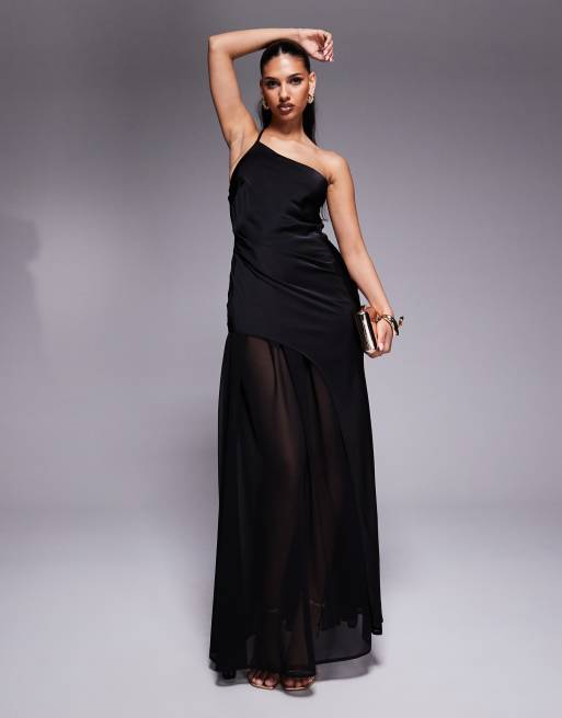 ASOS DESIGN - Vestito lungo monospalla in raso e chiffon nero asimmetrico