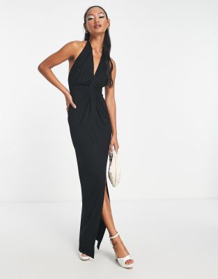 ASOS DESIGN - Vestito lungo nero con nodo e scollo super profondo