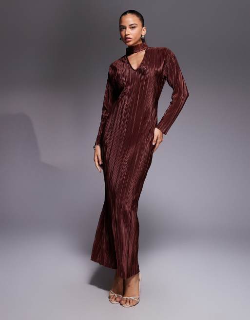 ASOS DESIGN - Vestito lungo plissé color cioccolato con collarino e davanti a V