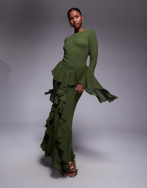 ASOS DESIGN - Vestito lungo verde bosco a maniche lunghe con volant