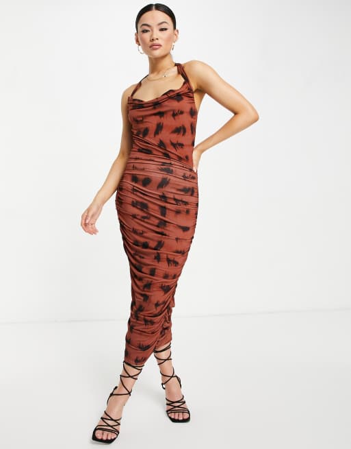 ASOS DESIGN - Vestito midi arricciato e allacciato al collo con stampa animalier sfocata