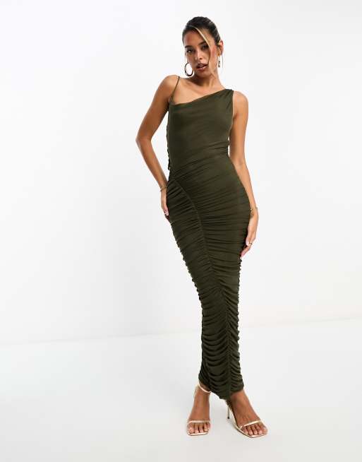 ASOS DESIGN - Vestito midi asimmetrico stile canottiera con scollo ad anello kaki con gonna arricciata in diagonale