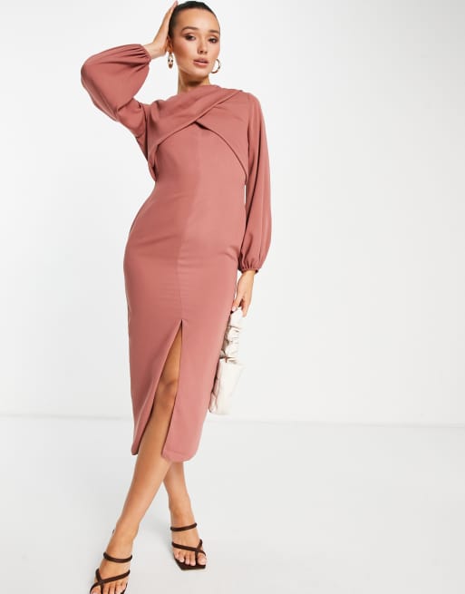 ASOS DESIGN - Vestito midi avvolgente a maniche lunghe rosa