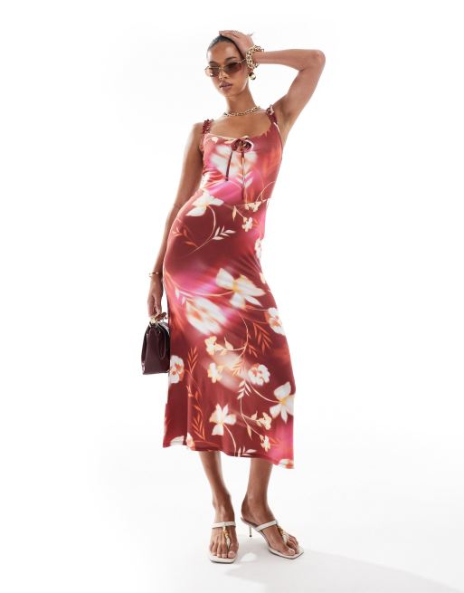 ASOS DESIGN - Vestito midi bordeaux a fiori allacciato sul davanti con volant sulle spalline