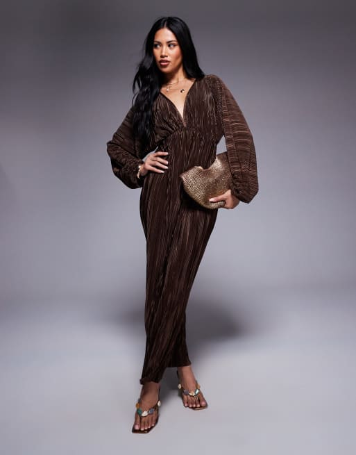 ASOS DESIGN - Vestito midi color cioccolato plissé con maniche a palloncino e scollo a V frontale