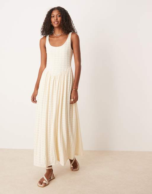 ASOS DESIGN - Vestito midi color crema testurizzato con vita scesa e scollo rotondo
