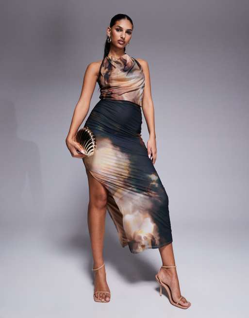 ASOS DESIGN - Vestito midi con scollo ad anello alto in chiffon di jersey con stampa astratta gialla