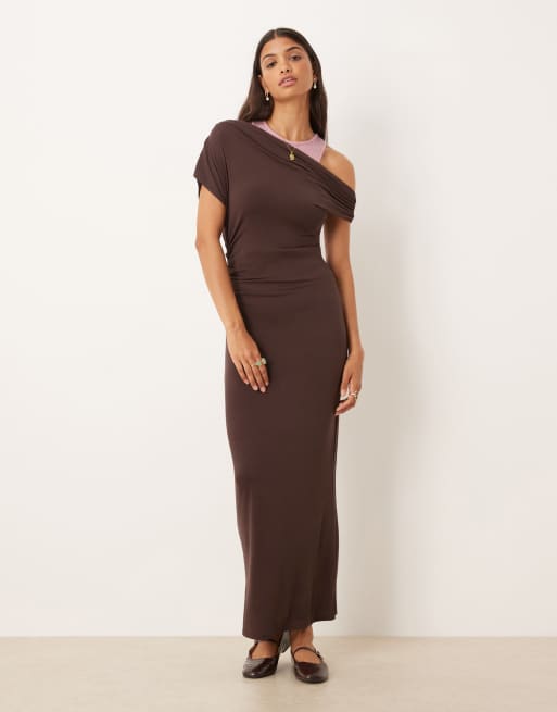 ASOS DESIGN - Vestito midi con spalle scese e strato inferiore a vogatore rosa e cioccolato