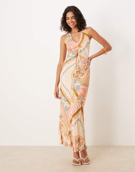 ASOS DESIGN - Vestito midi con stampa a fiori stile cartolina, scollo a V e arricciatura con laccetti