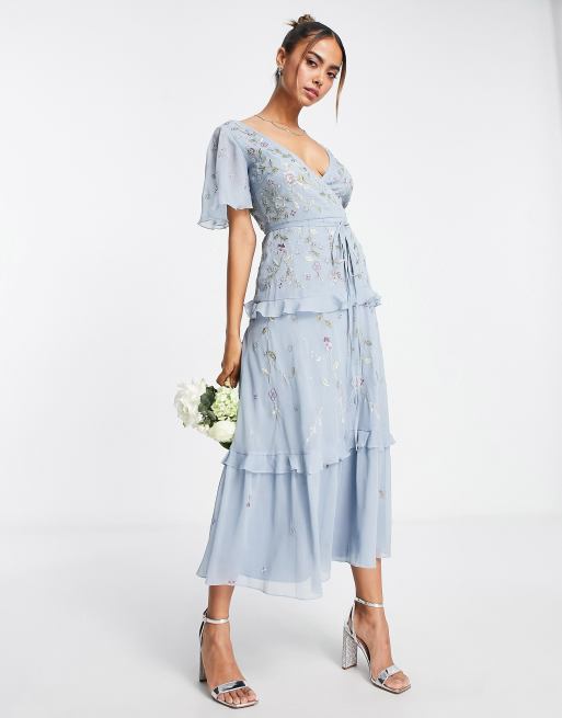 ASOS DESIGN - Vestito midi da damigella avvolgente blu crepuscolare con ricami e decorazioni e maniche con volant