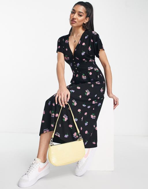 ASOS DESIGN - Vestito midi da giorno stretto in vita con bottoni nero a fiori