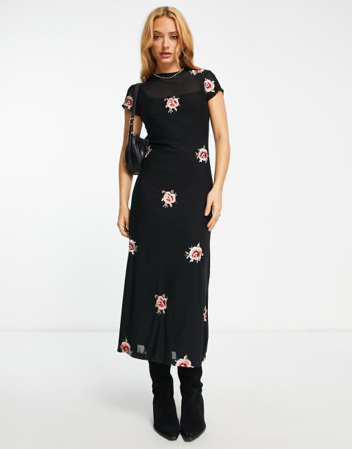 ASOS DESIGN - Vestito midi fasciante nero in rete con ricami floreali