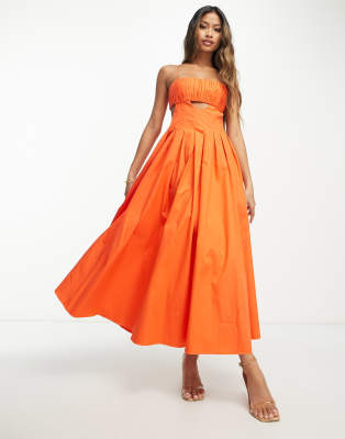 ASOS DESIGN - Vestito midi in cotone strutturato arancione acceso con busto arricciato e gonna a pieghe