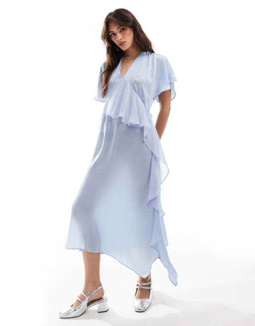 ASOS DESIGN - Vestito midi in raso azzurro con volant asimmetrici