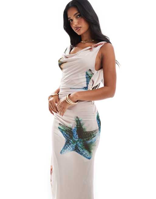 ASOS DESIGN - Vestito midi in rete con scollo rotondo, spalline attorcigliate e stampa di stelle marine