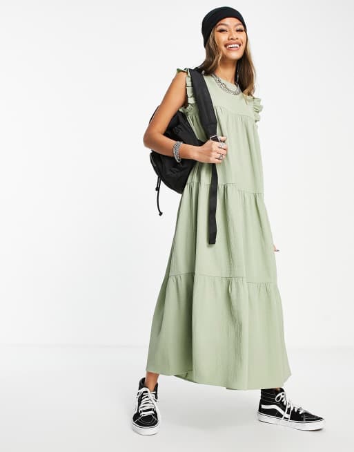 ASOS DESIGN - Vestito midi kaki pallido con maniche con volant